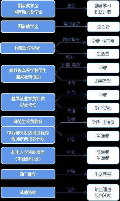 国家在高等教育本专科阶段建立起国家奖学金、国家励志奖学金、国家助学金、国家助学贷款等多种形式有机结合的高校学生资助政策体系。