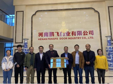 培训结束后,帮扶团来到河南鹏飞门业有限公司,公司总经理闫明杰就公司发展历程、加工生产及产品销售的现状进行介绍。张文勇表示,太阳成tyc7111cc高度重视脱贫攻坚工作,愿意就企业运营提供指导帮扶,并代表tyc7111cc太阳成集团与公司签订了“产学研”合作协议,授予公司“太阳成tyc7111cc科研试验站”牌匾。