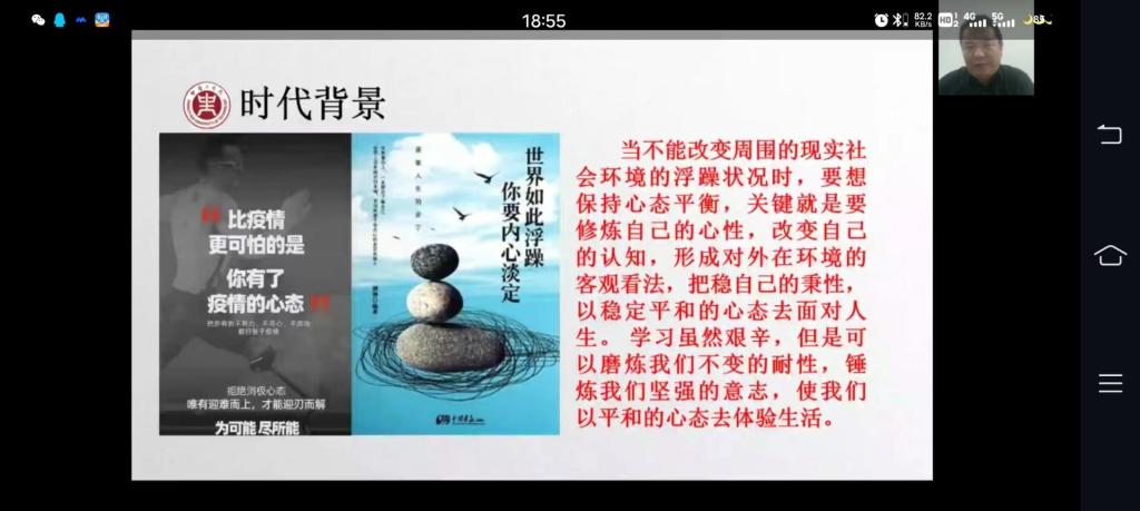 会议开始,陶建格以中国共产党辉煌的发展历程为切入点,由浅入深的指出当前疫情下大学生所出现的问题,表示同学们应学习党的精神,以稳定平和的心态去面对人生。随后,陶建格从科学人生观、将人生设计与国家和民族利益整合和为什么要考研这三个方面,深入浅出的教育同学们在大变局时代,要增强定力,在学习这条艰辛之路上要心存信仰,努力修行。讲座结束后,陶建格热情的回复了同学们提出的各种问题。