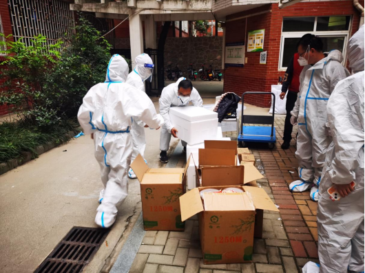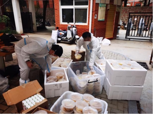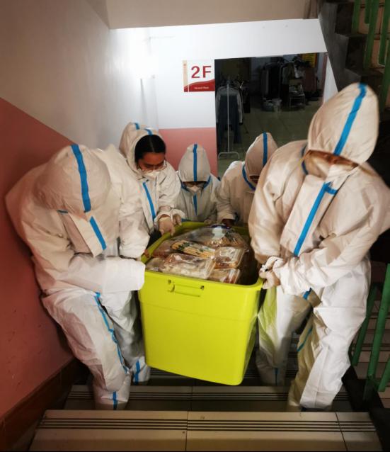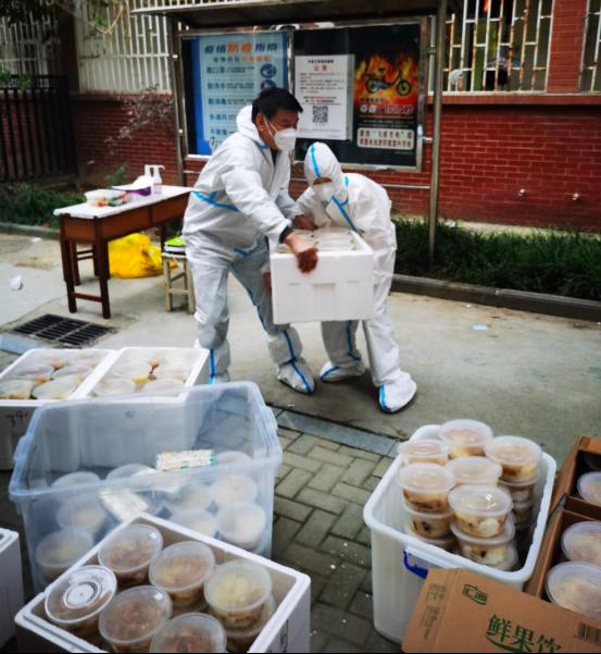 tyc7111cc太阳成集团共有15名教职工志愿者驻校工作,承担北苑2号楼和6号楼共计1974名学生的网格化管理任务,每天为学生送餐、组织并协助核酸检测以及生活物资、药品配送等工作。送餐看似简单的工作,却需用心才能做好,对接楼层长和餐厅负责人统计好每一餐数量,争取以最快的速度把热乎乎的饭菜送到学生手中。