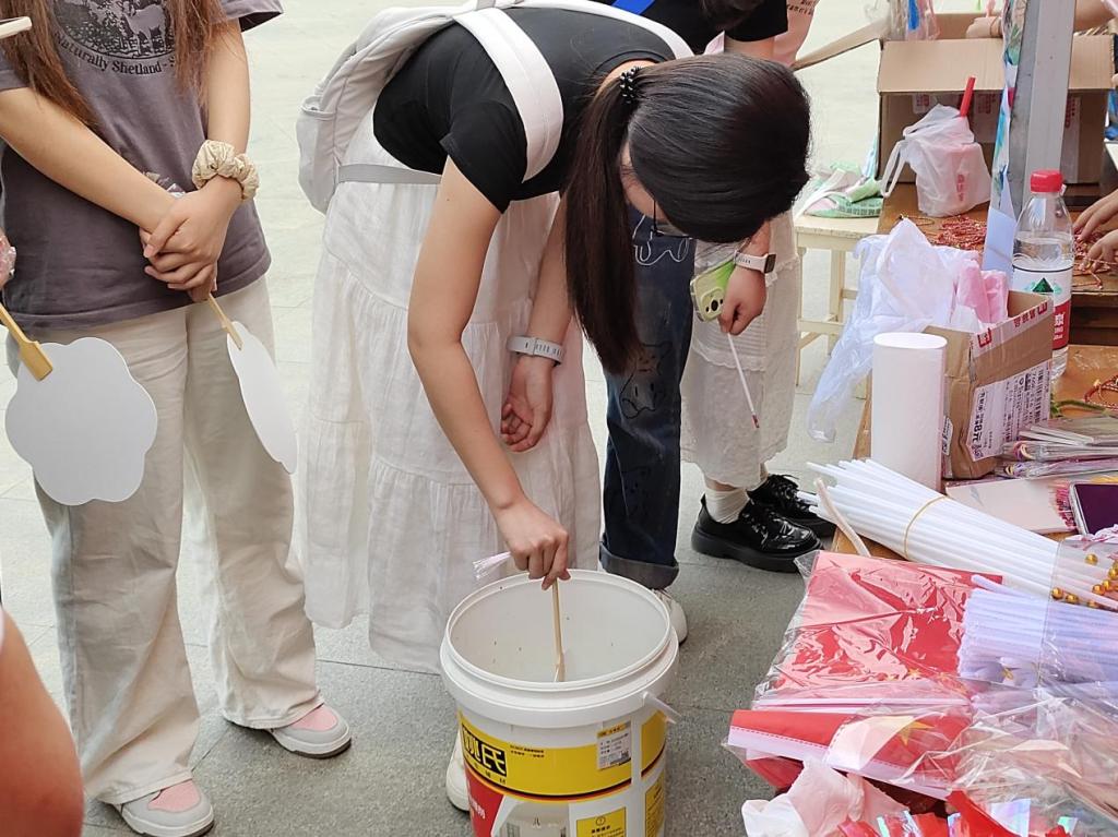 非遗漆扇DIY区域,同学们精心挑选颜色,用心制作属于自己的独特漆扇,每一把扇子都凝聚着创意与巧思。而在粽子扭扭棒区域,大家则编织出一个个可爱的粽子饰品,作为端午节的纪念。飞花令环节中,写满话语的卡片承载着大家的情感与思绪,在空中传递着温暖与感动。