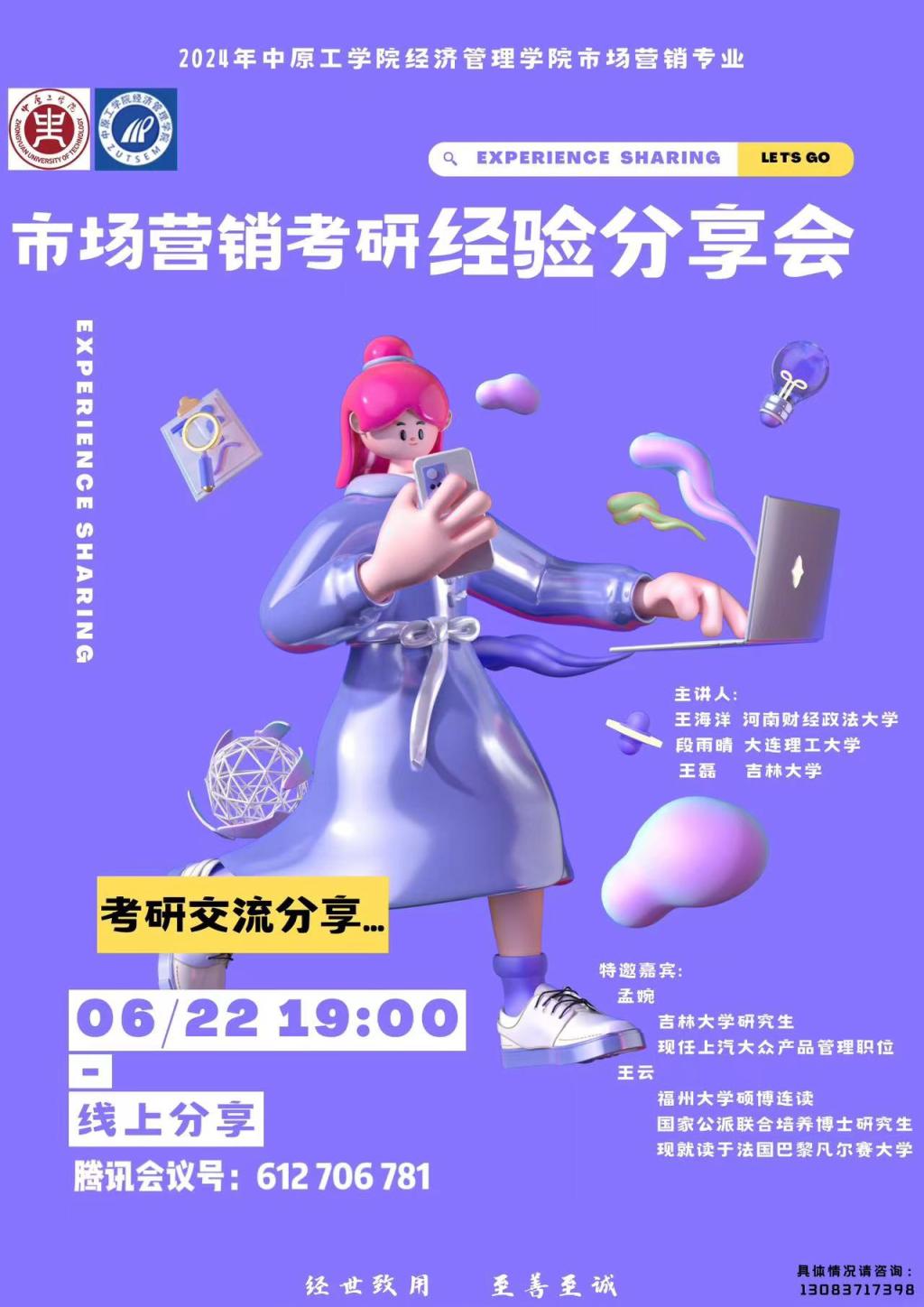 2024年6月22日晚上7点,我校市场营销专业召开了考研经验分享会。由我校优秀考研毕业生王磊(吉林大学)、董豪杰(中国计量大学)、王海洋(河南财经政法大学)等作为主讲人为大家传授经验,以及孟婉(吉林大学)和王云(福州大学)作为特邀嘉宾为大家进行分享与补充。这次分享会筹备一个月之久,针对性非常之强,先期收集在校生所需所求,主讲人根据在校生反馈意见各自负责一个模块并设计主讲内容。