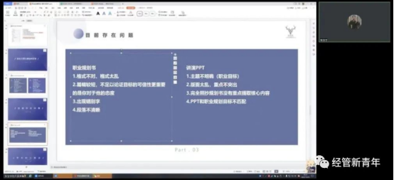张宝宇从职业生涯计划书如何撰写、职业生涯大赛如何演讲、参赛过程中存在的问题,这三个方面为参赛选手详细进行了讲解与解读,并结合自身实际参赛情况,以打比方、举例子等方式,帮助学生更清晰了解比赛全过程。最后还鼓励所有同学多去参加类似大赛,从比赛中提高自身专业素质,锻炼提升个人能力。此次赛前培训会,帮助参赛学生丰富参赛知识及参赛技巧,为后期我院学生顺利参与比赛奠定基础。