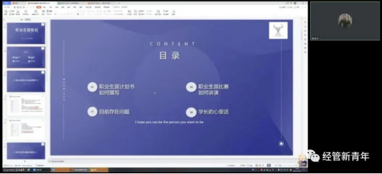 2022年10月18日晚上7点15分,我院在腾讯会议平台举办“雅迪杯”大学生职业生涯规划大赛赛前培训会。邀请18级市场营销专业毕业生张宝宇为我院学生分享比赛相关经验。
