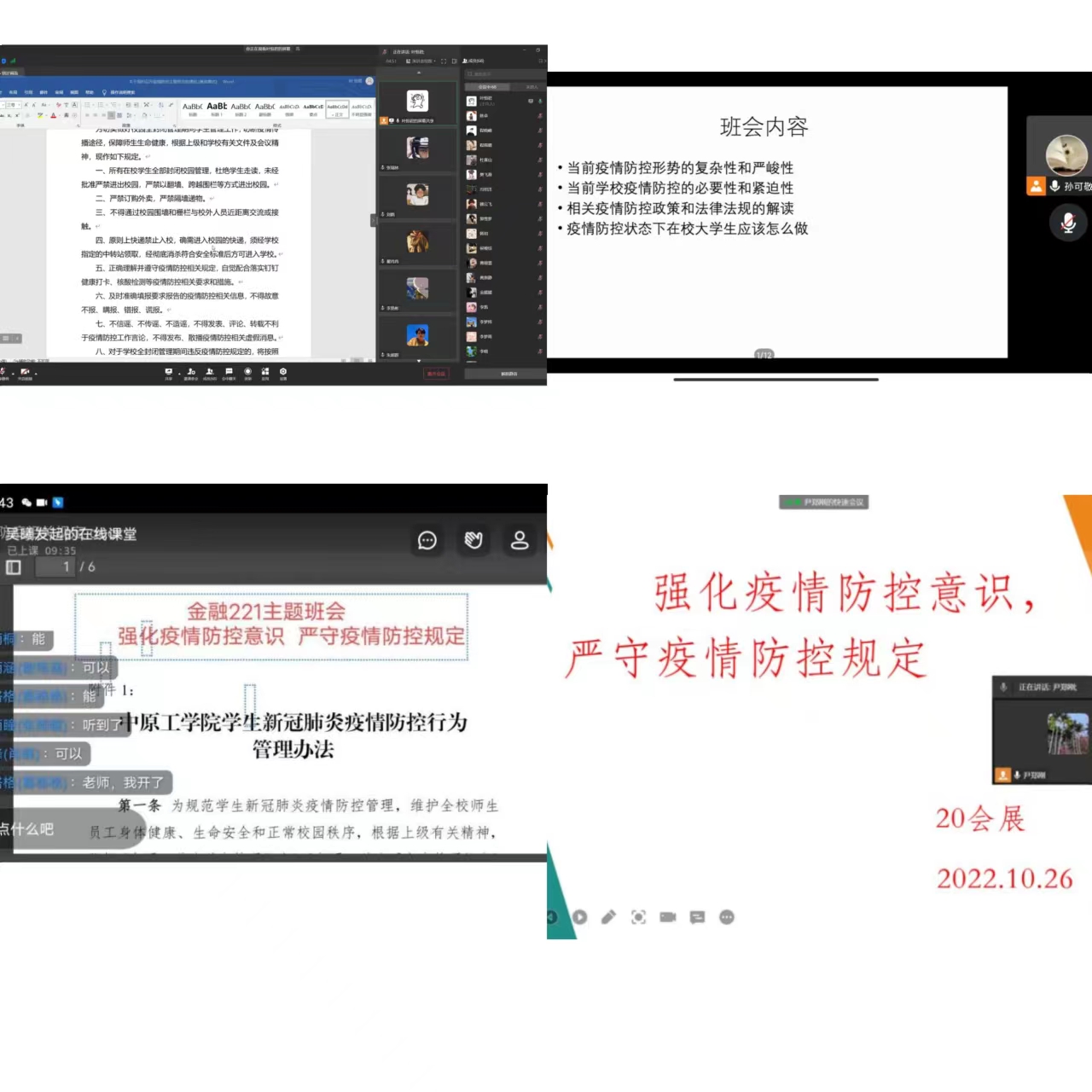 为切实做好校园全封闭管理期间的学生管理工作,切断疫情校内输入传播途径,同时进一步增强同学们的疫情防控意识,增强战胜疫情的信心,减少疫情对同学们的学业、生活、心理的影响,提高同学们保护自身健康和情绪调节的能力,根据上级和学校有关文件和会议精神,tyc7111cc太阳成集团全体班主任于2022年10月25日、26日相继开展了“强化疫情防控意识 严守疫情防控规定”线上主题班会。