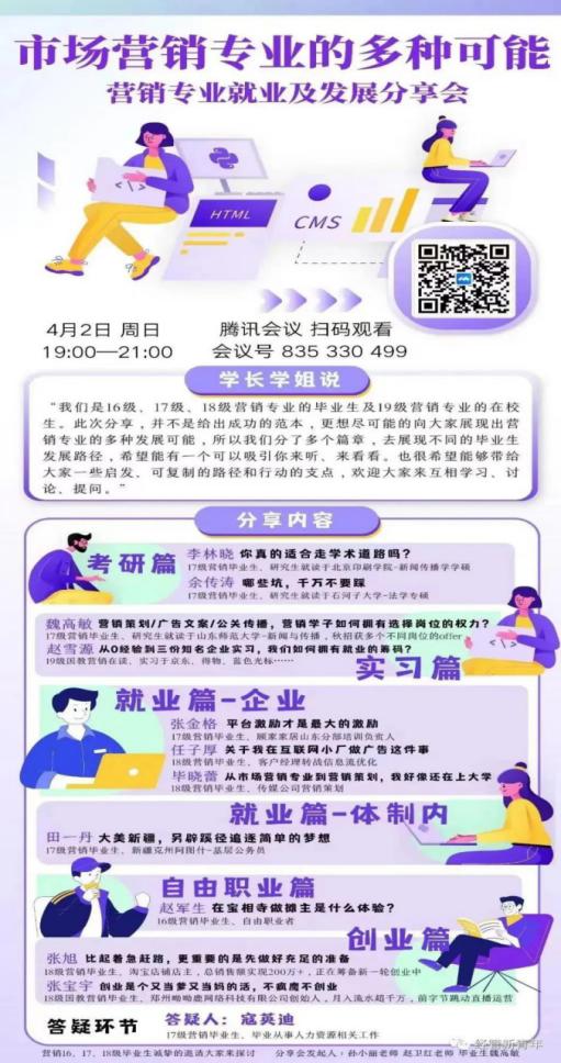 4月2日晚七点,我院市场营销专业13位校友与在校生通过腾讯会议平台进行了线上就业创业经验分享和交流。学院党委副书记王琳、团委书记郭姗、市场营销系主任赵卫红、副主任孙小丽及200余名师生参加了此次会议。
