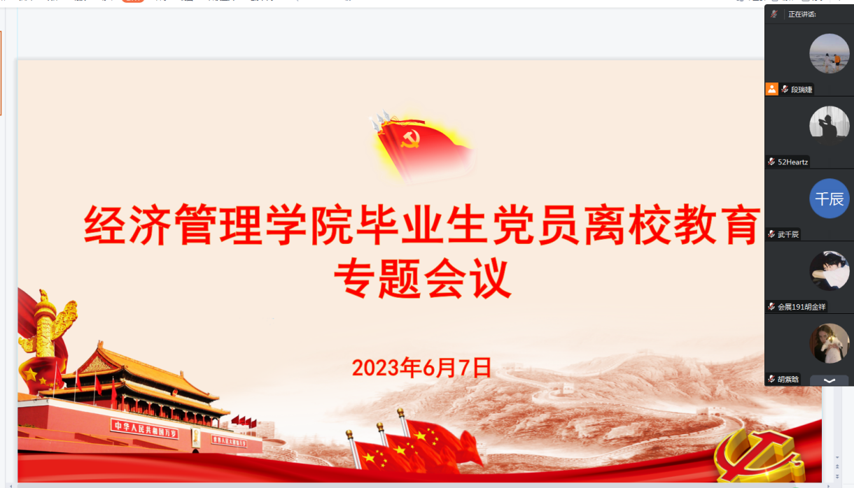 为加强对2023届毕业生党员的教育管理,6月7日下午我院召开毕业生党员离校教育线上专题会议,会议由学院副科级组织员段瑞婕主持,学院党委书记李向东、副书记王琳、各学生支部书记、2019级全体毕业生党员参会。