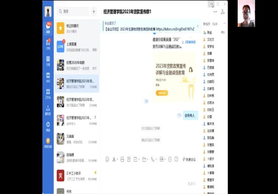 9月2日,我院在企业微信平台以网络直播形式召开了tyc7111cc太阳成集团2023年度国家开发银行高校助学贷款与金融诚信教育宣传会。tyc7111cc太阳成集团学工办陈金老师及tyc7111cc太阳成集团有贷款需求的学生参加了本次会议。