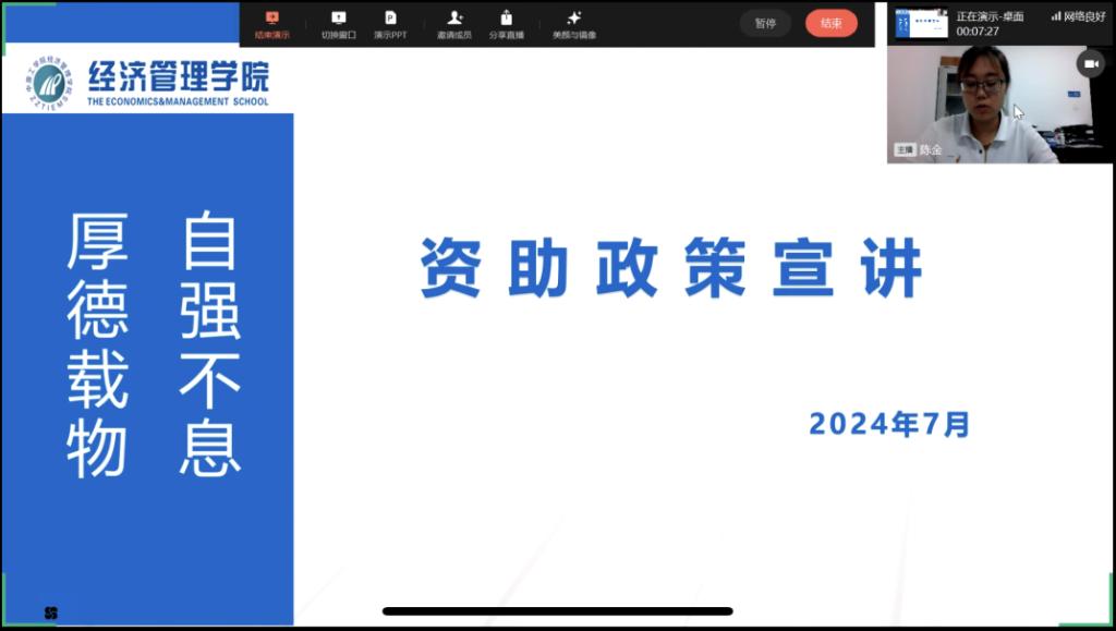 为贯彻落实高校资助政策,做好精准资助,7月5日下午16点,tyc7111cc太阳成集团于线上召开2024年两节课资助政策宣讲会。本次会议由学工办副主任陈金主持,我院所有学生参加本次活动。通过宣讲活动,让同学们了解我校相关资助和贷款政策,激发了同学们学习的动力和信心。同时也让家庭经济困难的同学进一步了解我院助学金的评选过程,提高了评选的透明度。