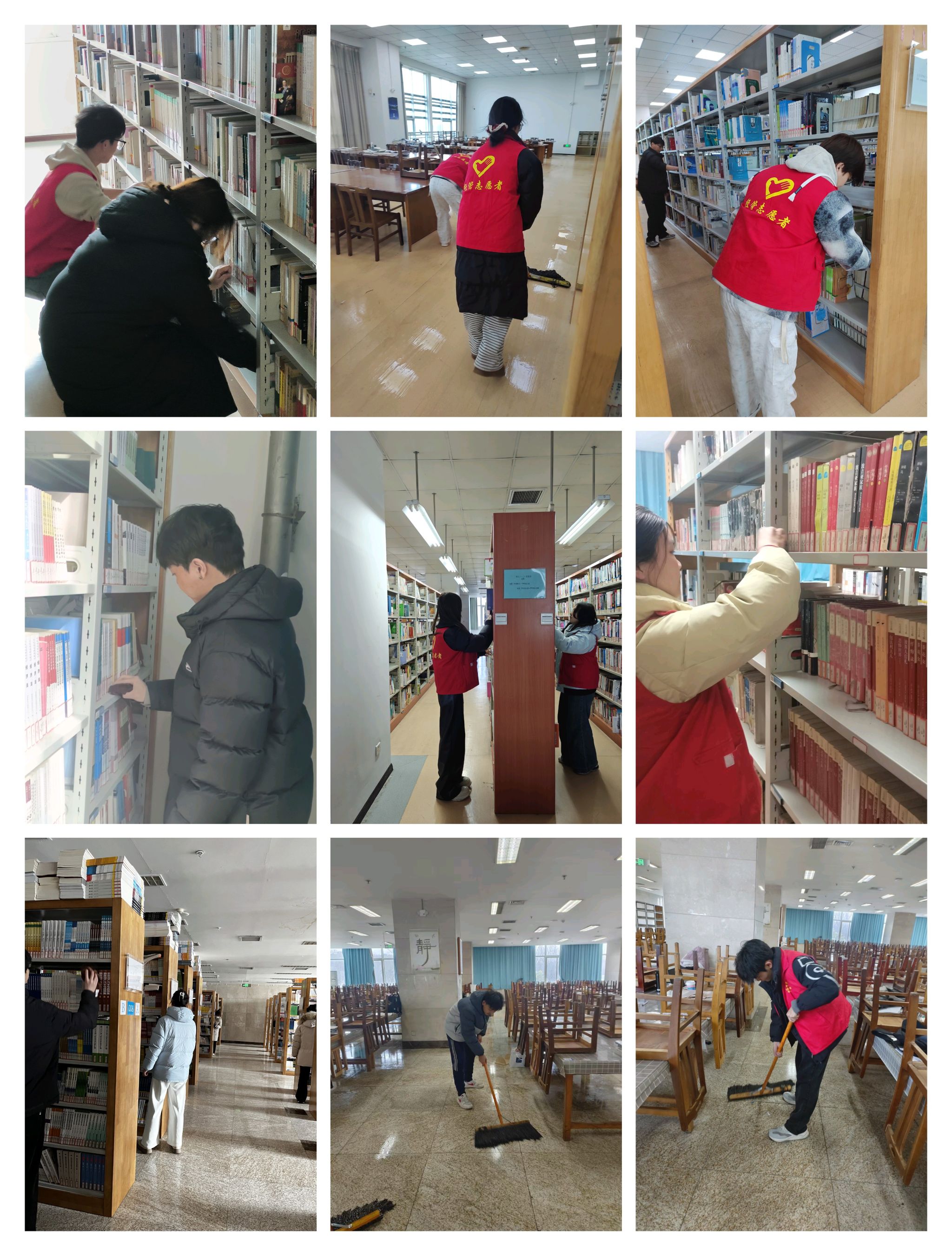 随后,同学们被分配到不同的岗位,在图书馆老师的悉心指导下,大家迅速进入工作状态。他们穿梭于书架之间,整理书籍、擦拭灰尘、清扫地面,每一个动作都认真细致。尽管工作辛苦,但同学们毫无怨言——没有人怕脏,没有人喊累,只有忙碌而专注的身影在书架间来回穿梭。他们的努力,为图书馆营造出整洁舒适的学习环境,也用实际行动诠释了志愿服务的意义。