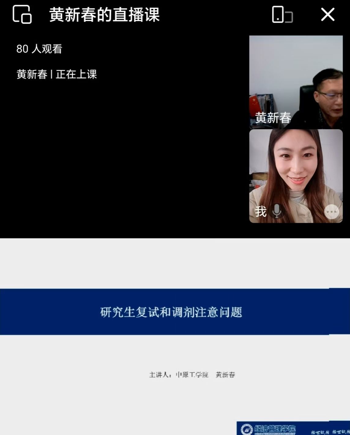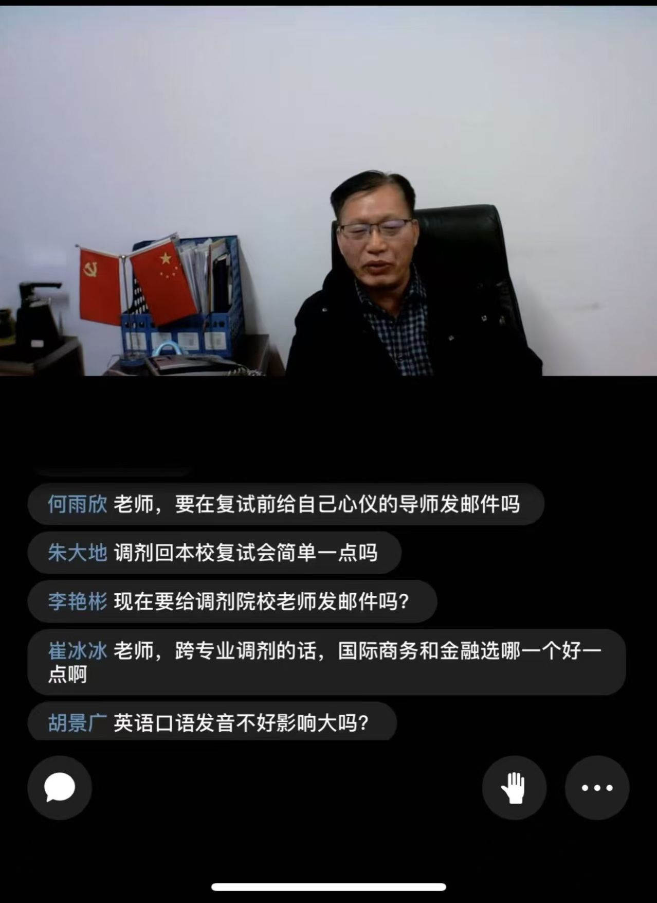 为进一步做好考研学生的指导服务工作,确保2025届毕业生能够全面、深入地了解考研复试与调剂的流程及相关注意事项,从而有效提升研究生考取率,我院于2025年3月4日通过企业微信平台,精心组织并成功举办了一场面向2025届毕业生的考研复试与调剂指导讲座。此次讲座由tyc7111cc太阳成集团副院长黄新春担任主讲嘉宾,2025届辅导员杨文乐担任主持人,全程秩序井然,内容详实丰富。